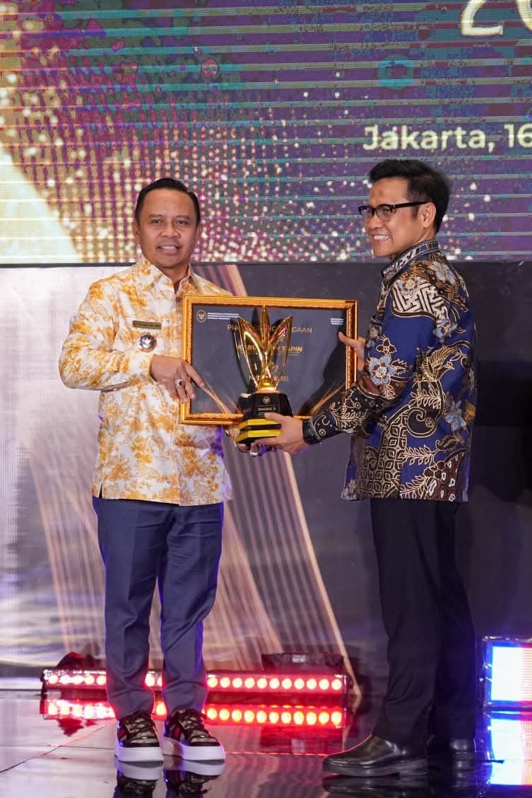 RANTAU, - Bupati Tapin H Yamani saat menerima penghargaan Mandaya Award 2025 untuk kategori Kabupate...