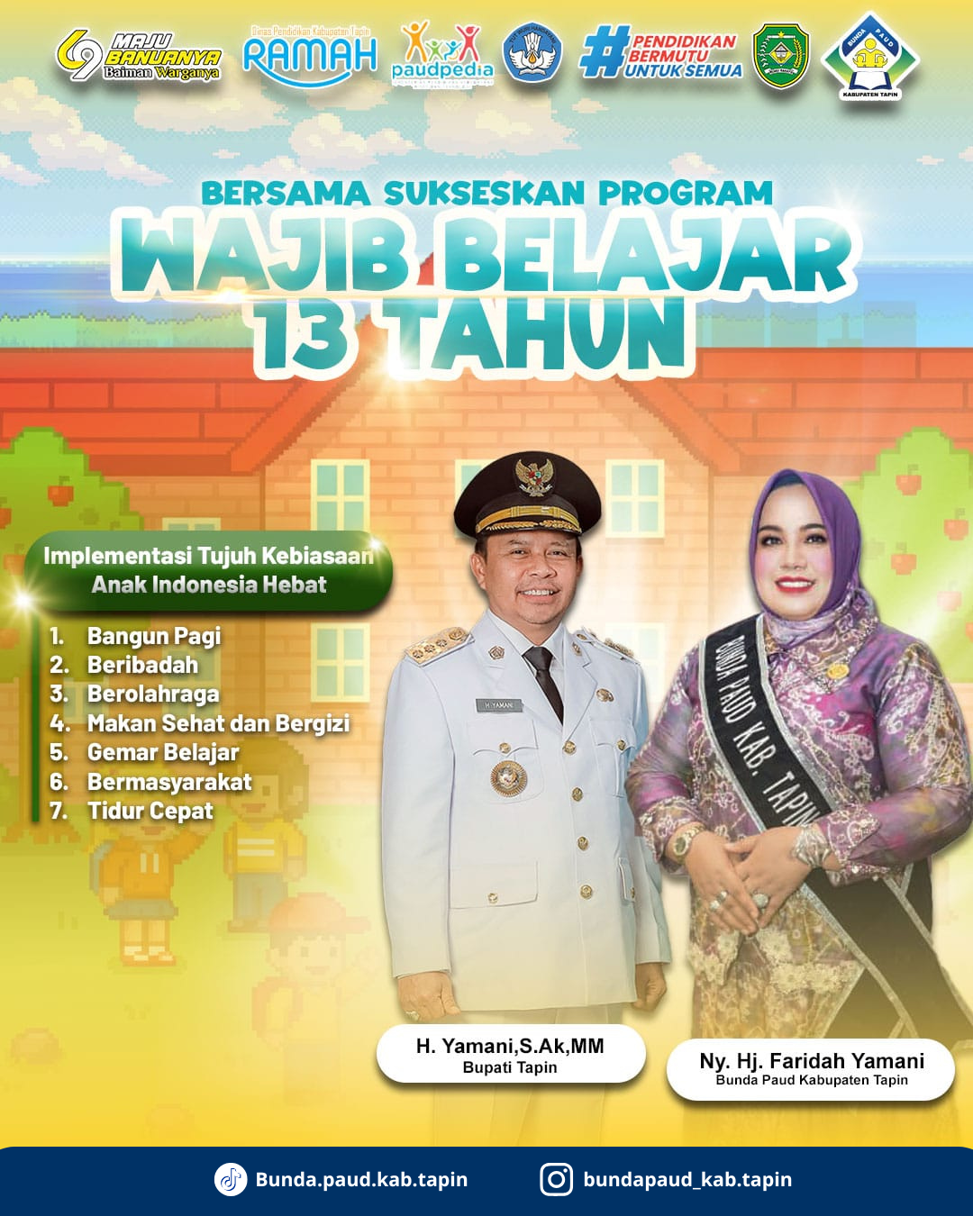 Anak-anak Indonesia merupakan masa depan bangsa. Untuk itu, pemerintah Kabupaten Tapin mendukung penuh Gerakan 7 Kebiasaan Anak Indonesia Hebat, ini merupakan inisiatif strategis untuk menanamkan kebiasaan-kebiasaan positif sejak usia dini agar tumbuh generasi yang cerdas, sehat, berkarakter dan siap menghadapi tantangan dunia.